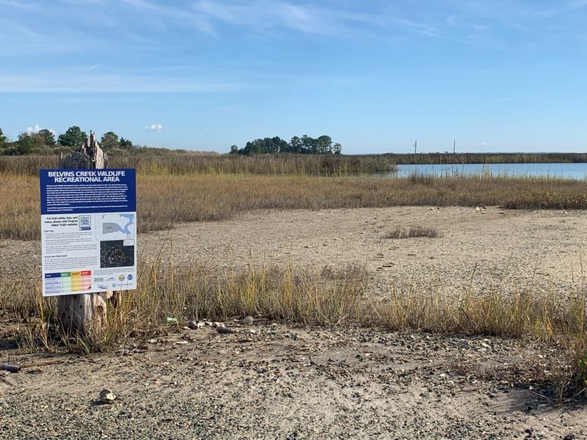 Belvins Creek Wildlife Recreational Area is 10.25-acres that abuts Belvins Creek. You will find that you are parked at the Virginia Department of Transportation (VDOT) road ending at the end of Belvins Road. To the extent possible, please park on the left side when facing the water. Enter the Middle Peninsula Chesapeake Bay Public Access Authority (MP-PAA) property on foot (behind this sign) and walk away from the VDOT road, carry your car-top craft to the water. At the shore you will be able to launch onto Belvins Creek, a tributary of Browns Bay. Follow the creek to the main stem and paddle north. This will take you to Browns Bay. Once at Browns Bay you can paddle along the marsh, to the right, and meet up with Maundy Creek Water Trail. This water trail is an intermediate level paddle and winds through the back islands and marshy areas of the Guinea Marshes. Visitors can also walk the property to enjoy the views and bird watching.