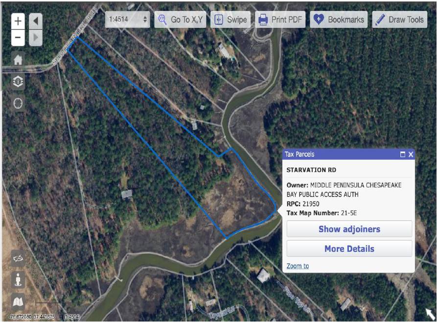 This is a 9.2-acre property in Gloucester County on the York River (Adams Creek) located of of Route 684, Starvation road. The site has a small entrance road and parking, with views of Adams Creek, just off of the York River in Upper Gloucester. Paddling of Adams Creek is available with a short walk to the water for a kayak launch. This property is available for BOW HUNTING on Monday, Wednesdays, and Friday. Reservations can be made for 1 to 2 days for BOW HUNTING and for a maximum of 2 hunters. The $10 reservation cost will cover one day of BOW HUNTING.